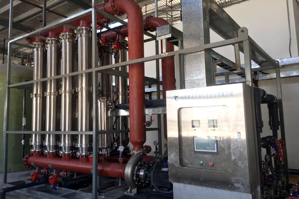 山東泰禾環保科技股份有限公司循環水廢水回用處理系統包括一體化高速反應池,壓濾機去硬度和固體雜質,然后依次連接的自清洗過濾器、陶瓷膜超濾組件和RO反滲透膜組件,該循環冷卻水廢水回用系統的脫鹽率大大提高,作為循環冷卻水系統補給水循環使用,有效優化循環冷卻水水質,降低循環冷卻水的鹽分濃度。
