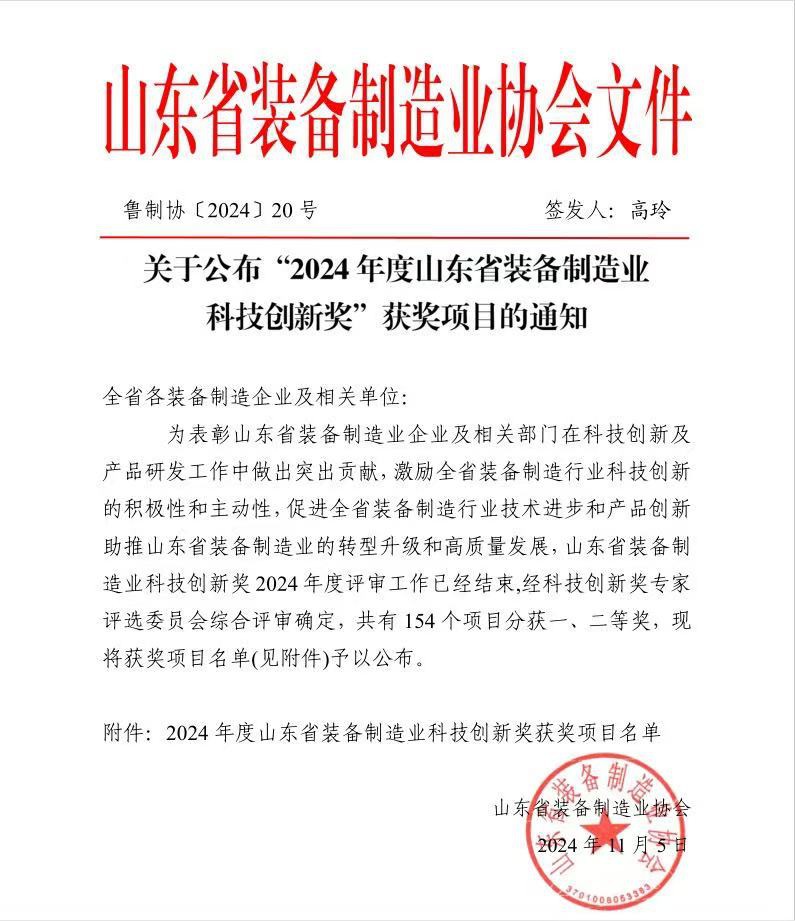 “2024 年度山東省裝備制造業科技創新獎”二等獎。